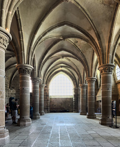 Den mäktiga romanska klosterkyrkan Mont-Saint-Michel liknar ett befäst slott,